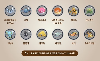 이벤트 기간 동안 10km 알에서 일레즌이 부화합니다. 색이 다른 일레즌을 만날 수도 있습니다. 일레즌은 아기 포켓몬으로 전기 타입과 독 타입 포켓몬이 있습니다.