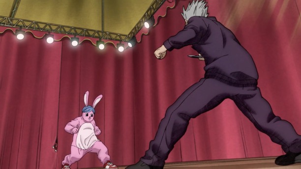 이벤트장에서는 슈가파크의 마스코트 토끼 슈가가 악마와 싸우는데요, 신은 토끼 탈인형을 쓰고 타츠와 싸웁니다. 영문을 모르는 관객은 슈가를 응원합니다. 사카모토 가족도 지켜보고 있는데, 사카모토는 신에게 타츠의 움직임을 무선으로 알려주고 최후의 일격을 가하도록 리드합니다.