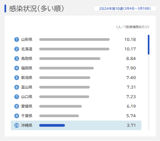 지역별 감염자 수는 야야마카가 10.18명으로 가장 높다.